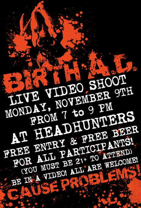 1) BIRTH A.D. is shooting a video, and we need your help to pack the club Headhunters and make it as insane as possible.